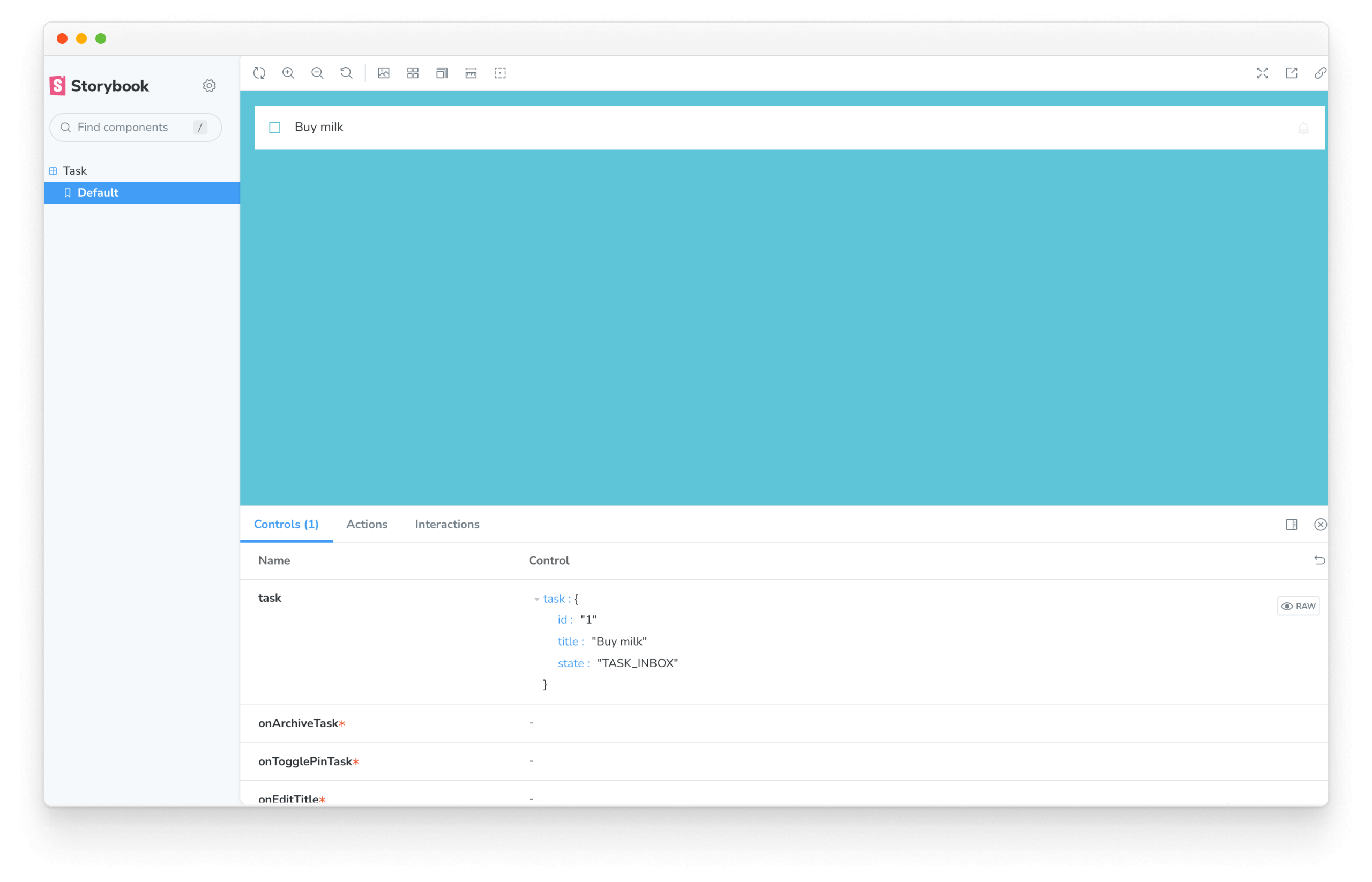 Let’s go back to that Task component. To isolate it means that we load up and render this one component by itself. For that, we need Storybook.