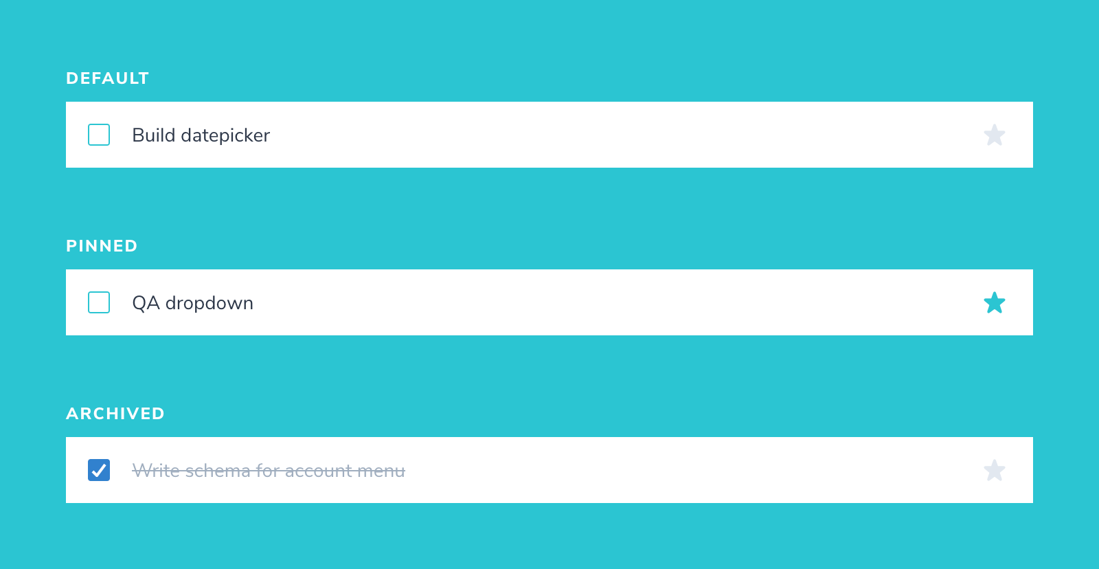 The Task component has three states—default, pinned and archived. We’ll add a story for each one.