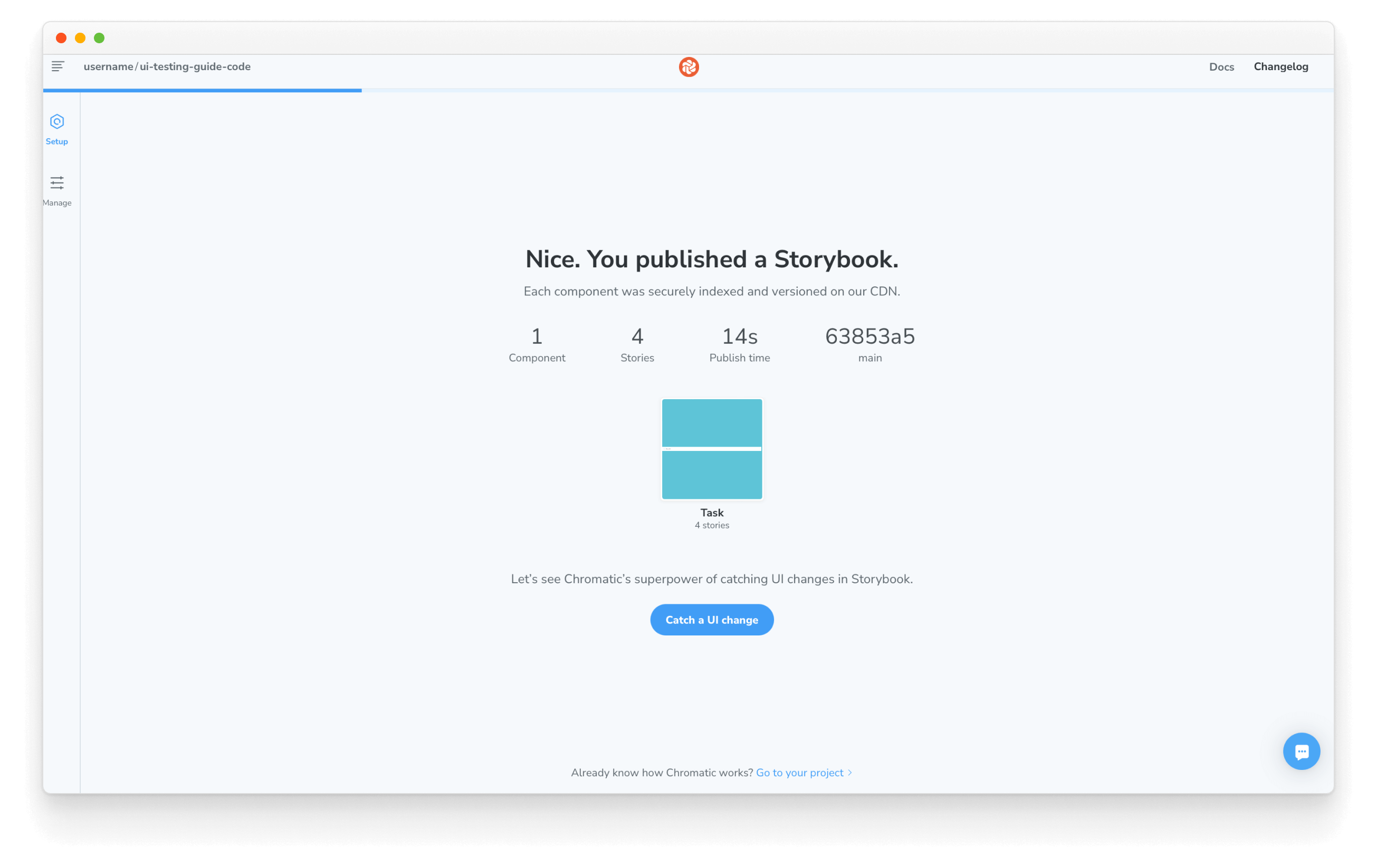 At this point, we know that the component is in a good state. Chromatic will capture an image snapshot of every story—as it appears in the browser. Then any time you make a change, a new snapshot is captured and compared to the previous one. You then review any visual differences found to decide if they are intentional updates or accidental bugs.